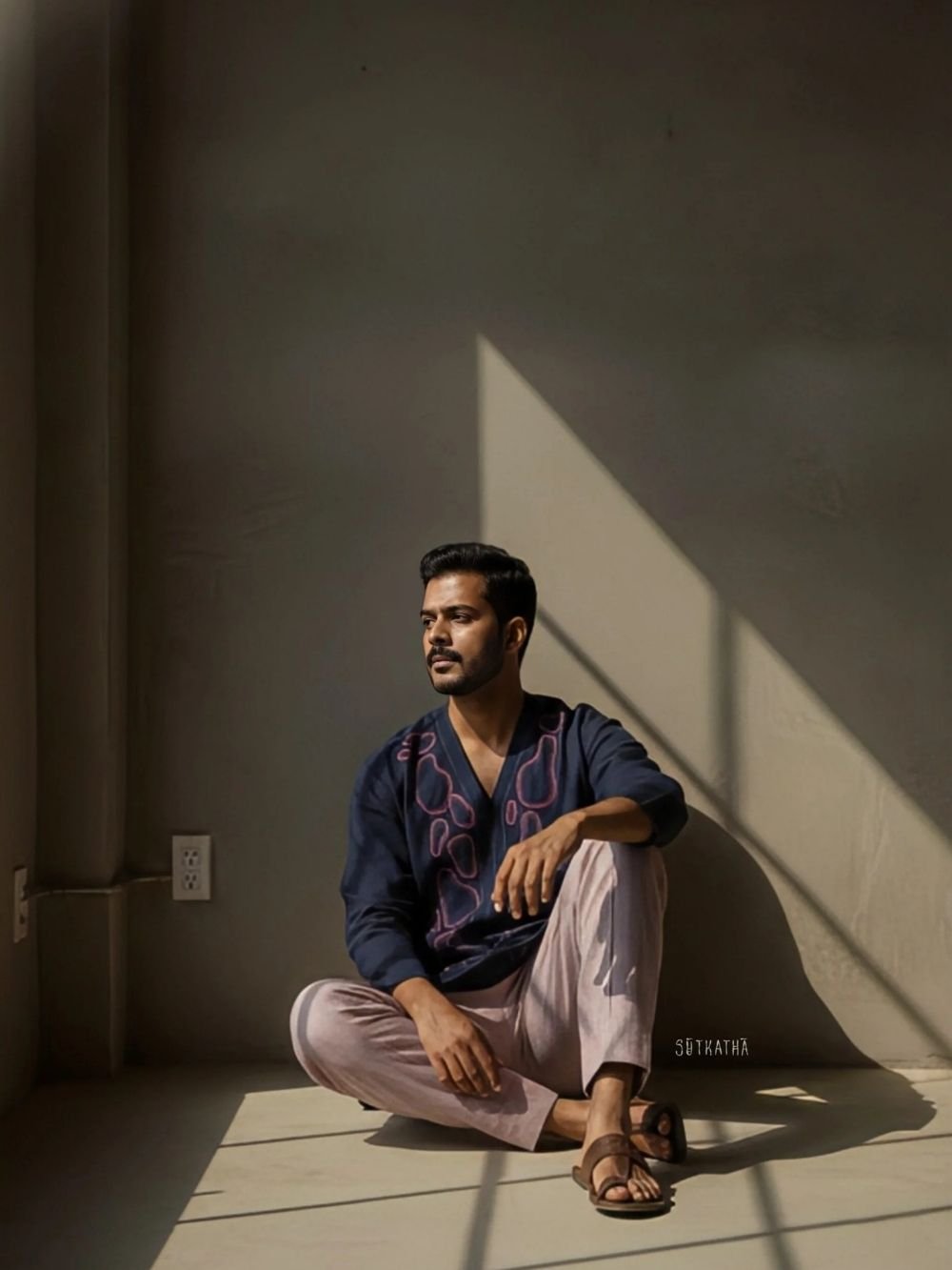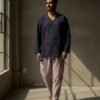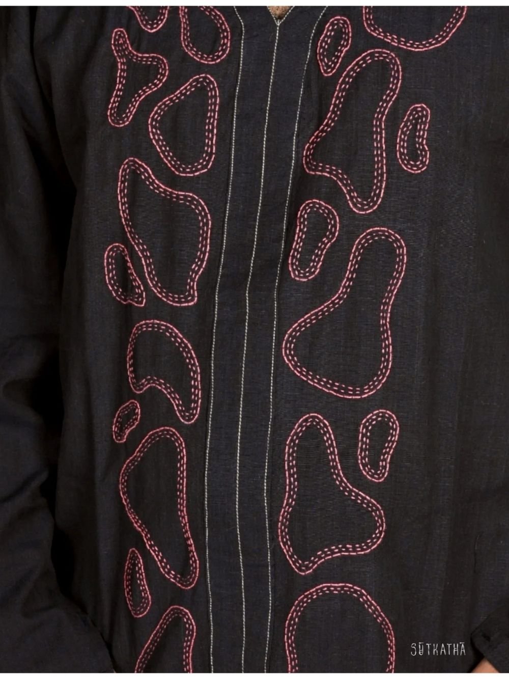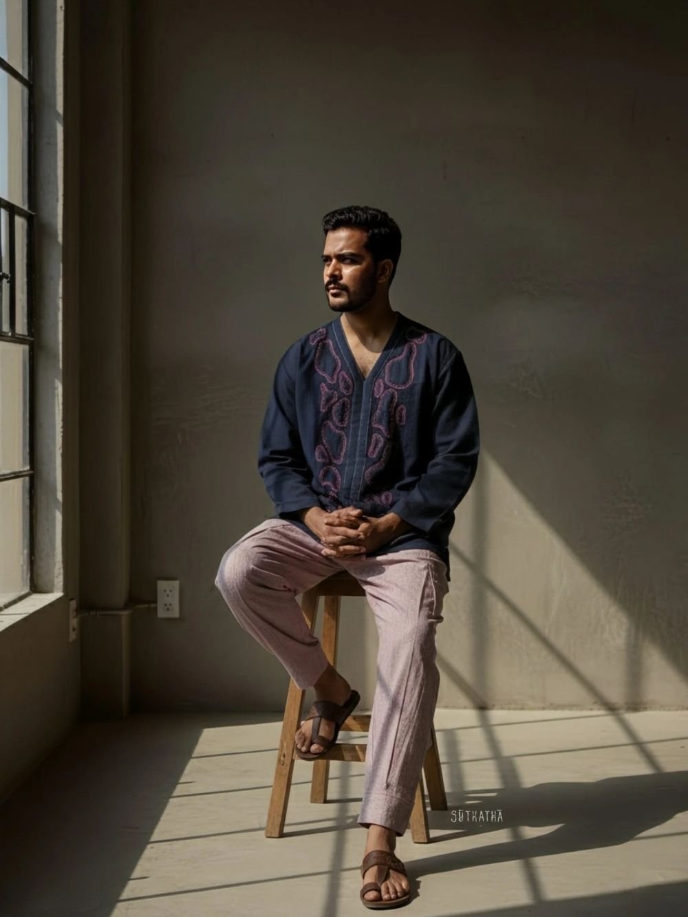 It has a V neckline, full sleeves, drop shoulders, an oversized fit and hand-embroidered Kantha abstract details on the front. Paired with our unisex Zen Pants, they make a perfect combo. It can also be clubbed well with your basic pair of denims, making it an essential in your wardrobe.