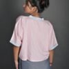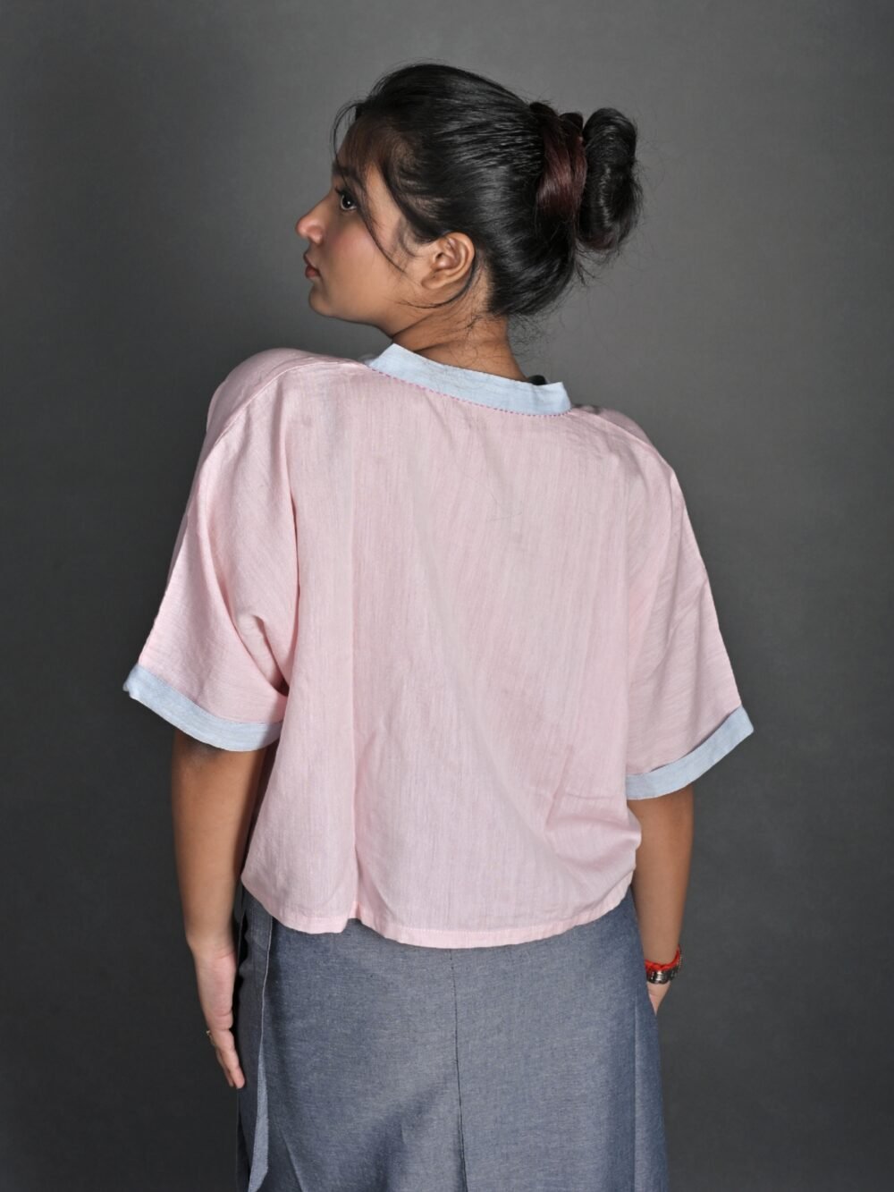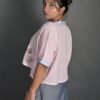 This top has a cropped silhouette and sports a kimono-style neckline, half sleeves, drop shoulders, and an oversized fit. It has Kantha embroidery details on the neckline and sleeves, and a hand-painted design on the front. It is a versatile piece that can be paired well with trousers, skirts and sarees.