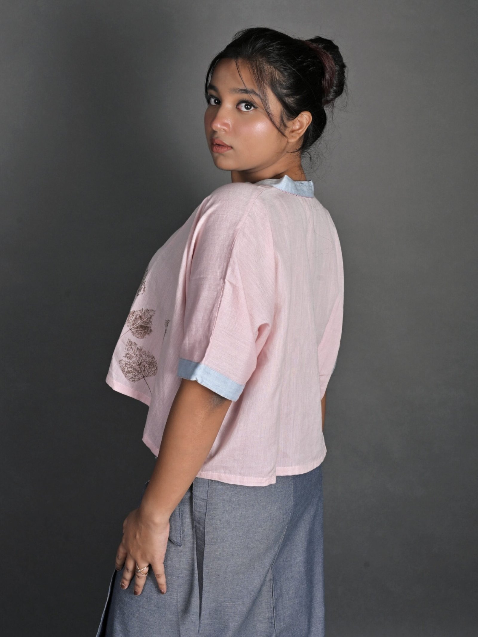 This top has a cropped silhouette and sports a kimono-style neckline, half sleeves, drop shoulders, and an oversized fit. It has Kantha embroidery details on the neckline and sleeves, and a hand-painted design on the front. It is a versatile piece that can be paired well with trousers, skirts and sarees.