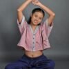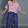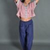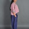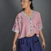 This top has a cropped silhouette and sports a kimono-style neckline, half sleeves, drop shoulders, and an oversized fit. It has Kantha embroidery details on the neckline and sleeves, and a hand-painted design on the front. It is a versatile piece that can be paired well with trousers, skirts and sarees.