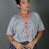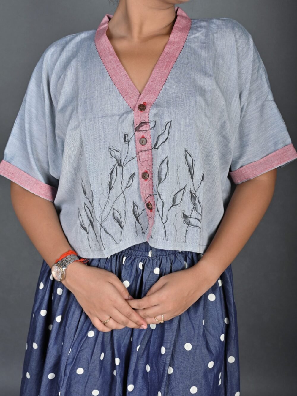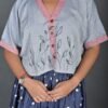 This top has a cropped silhouette and sports a kimono-style neckline, half sleeves, drop shoulders, and an oversized fit. It has Kantha embroidery details on the neckline and sleeves, and a hand-painted design on the front. It is a versatile piece that can be paired well with trousers, skirts and sarees.