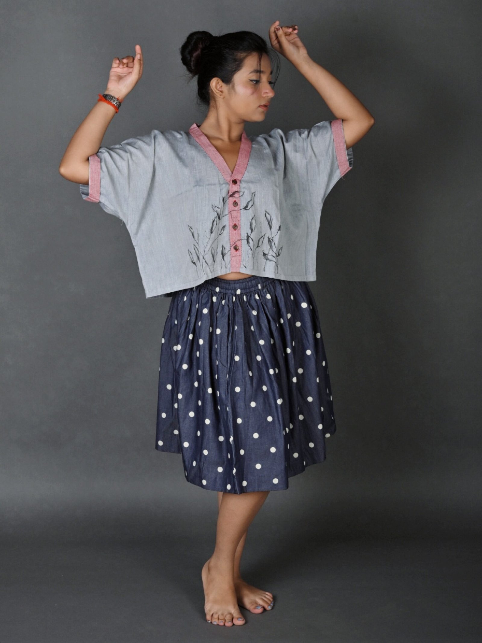 This top has a cropped silhouette and sports a kimono-style neckline, half sleeves, drop shoulders, and an oversized fit. It has Kantha embroidery details on the neckline and sleeves, and a hand-painted design on the front. It is a versatile piece that can be paired well with trousers, skirts and sarees.