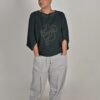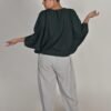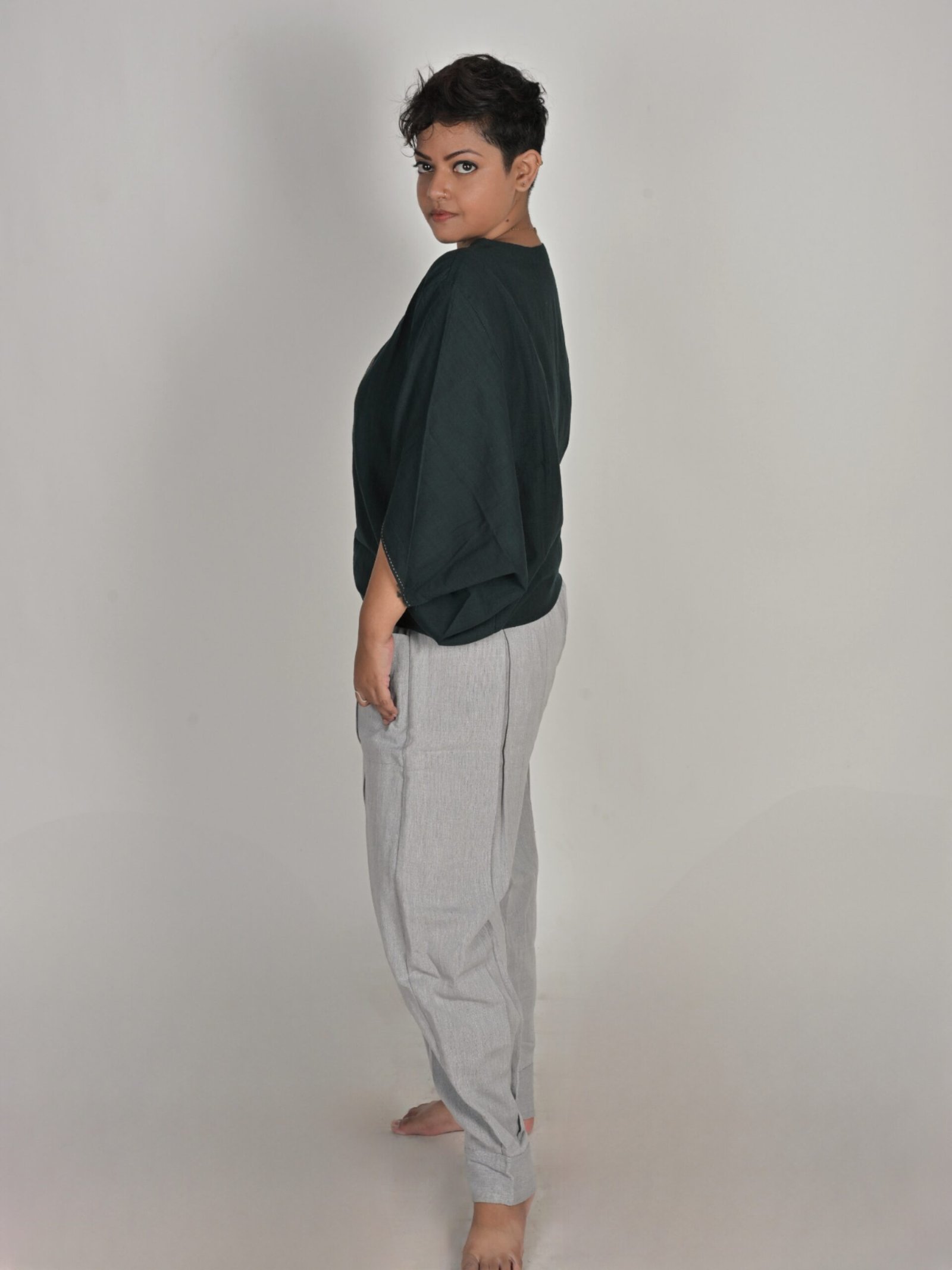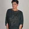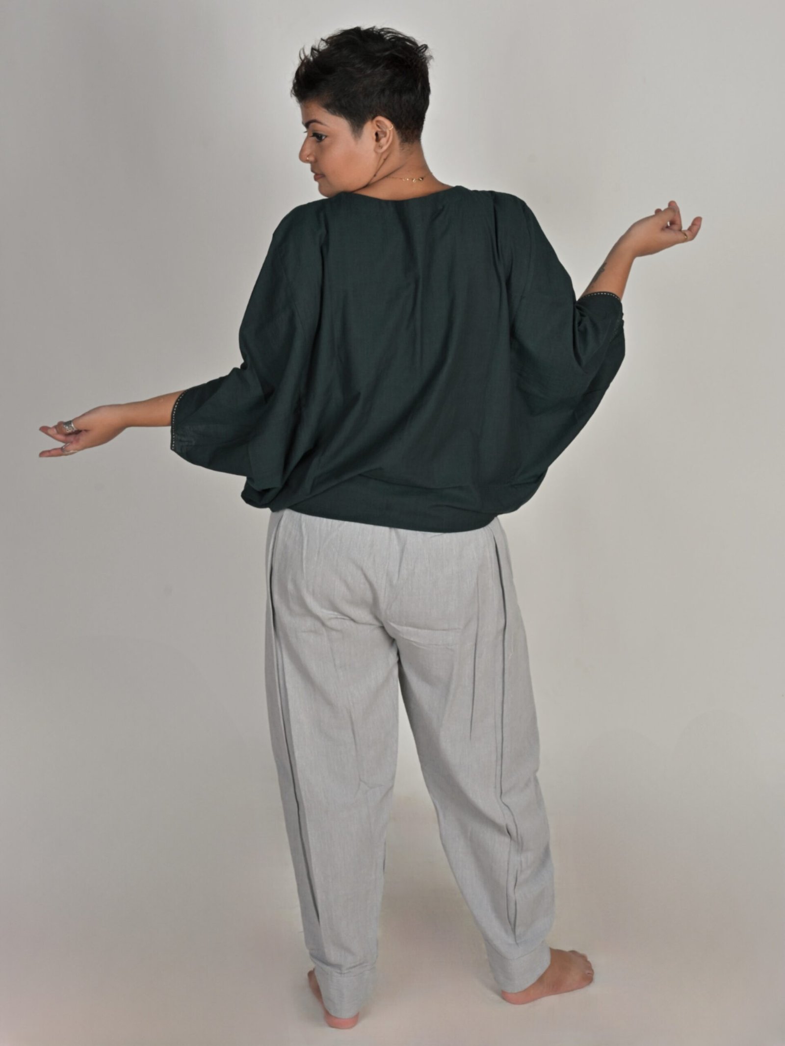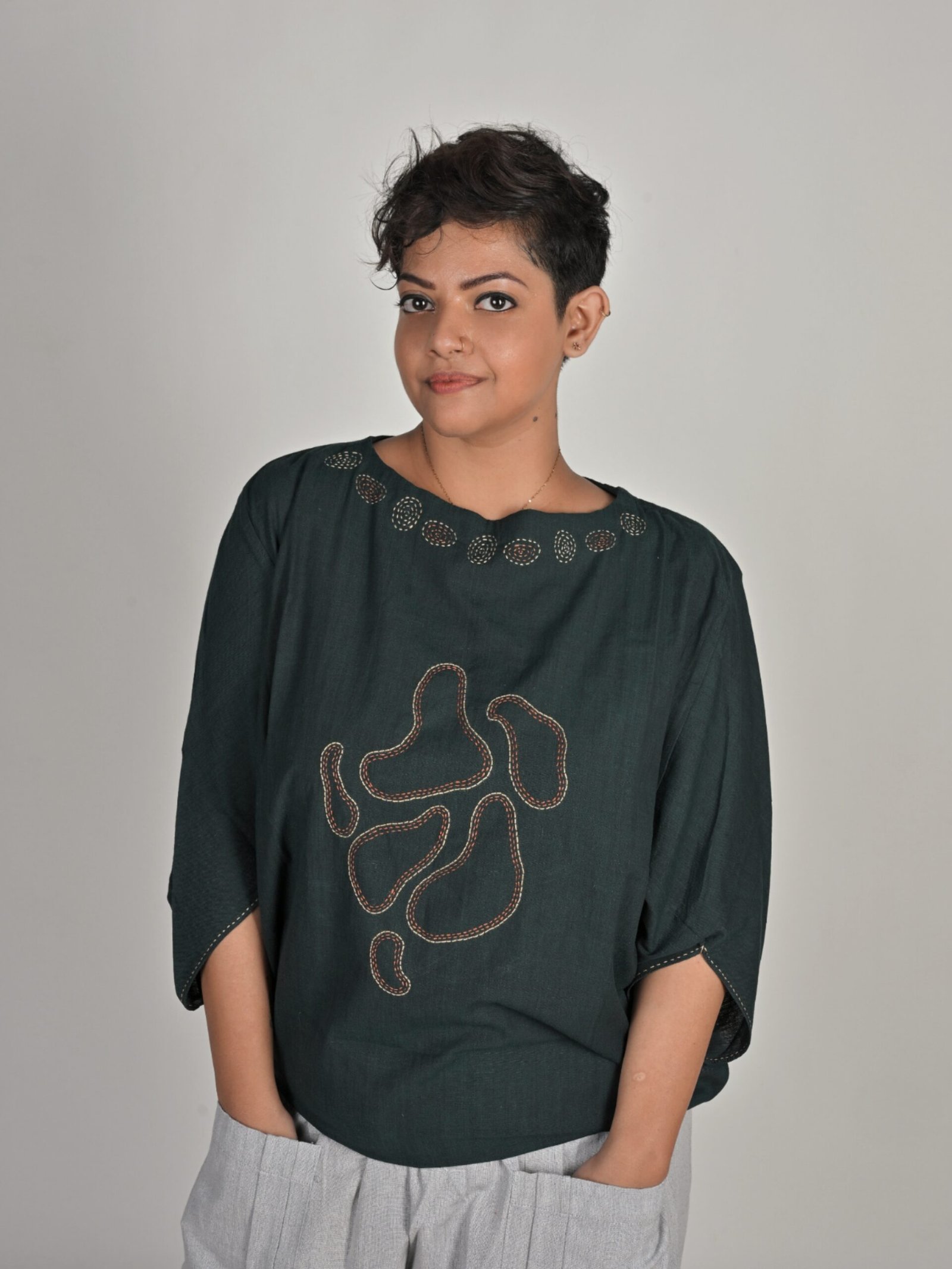 This top has a unique silhouette and sports a boat neckline, triangular sleeves, drop shoulders, and an oversized fit. It has Kantha embroidery details on the neckline, sleeves, and front.