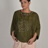 This top has a unique silhouette and sports a boat neckline, triangular sleeves, drop shoulders, and an oversized fit. It has Kantha embroidery details on the neckline, sleeves, and front.