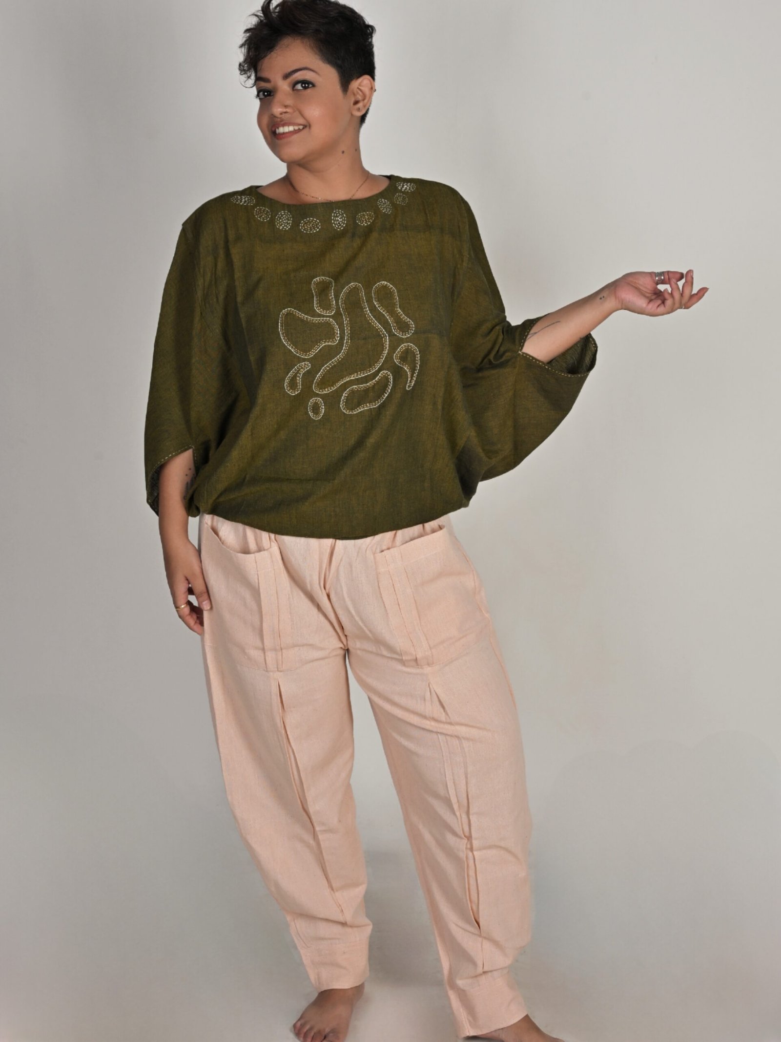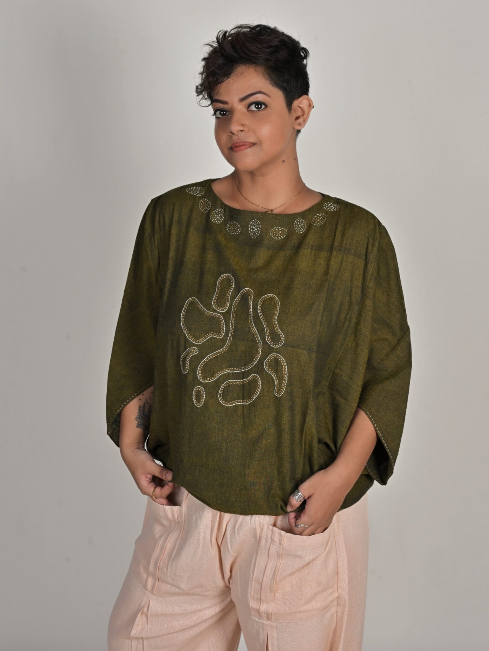 This top has a unique silhouette and sports a boat neckline, triangular sleeves, drop shoulders, and an oversized fit. It has Kantha embroidery details on the neckline, sleeves, and front.
