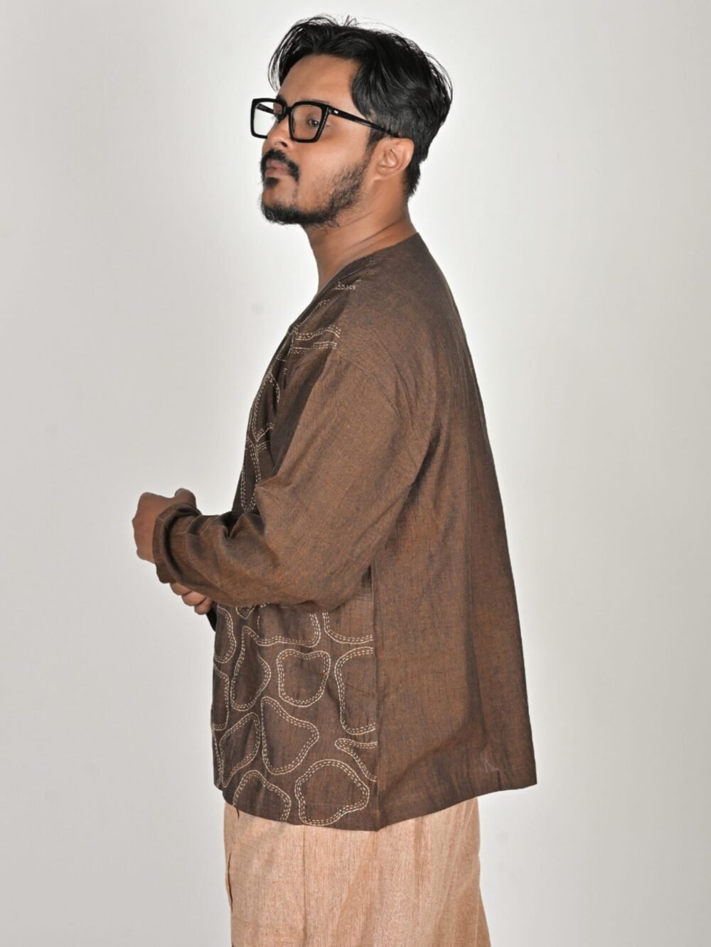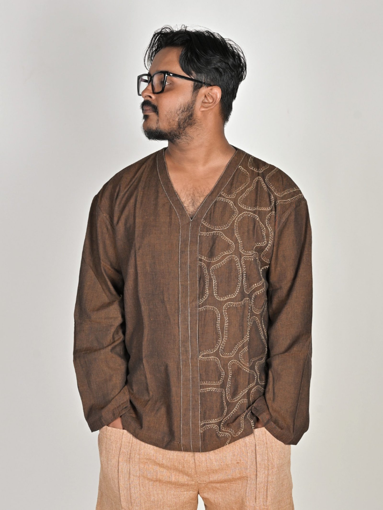 It has a V neckline, full sleeves, drop shoulders, an oversized fit and hand-embroidered Kantha abstract details on the front. Paired with our unisex Zen Pants, they make a perfect combo. It can also be clubbed well with your basic pair of denims, making it an essential in your wardrobe.