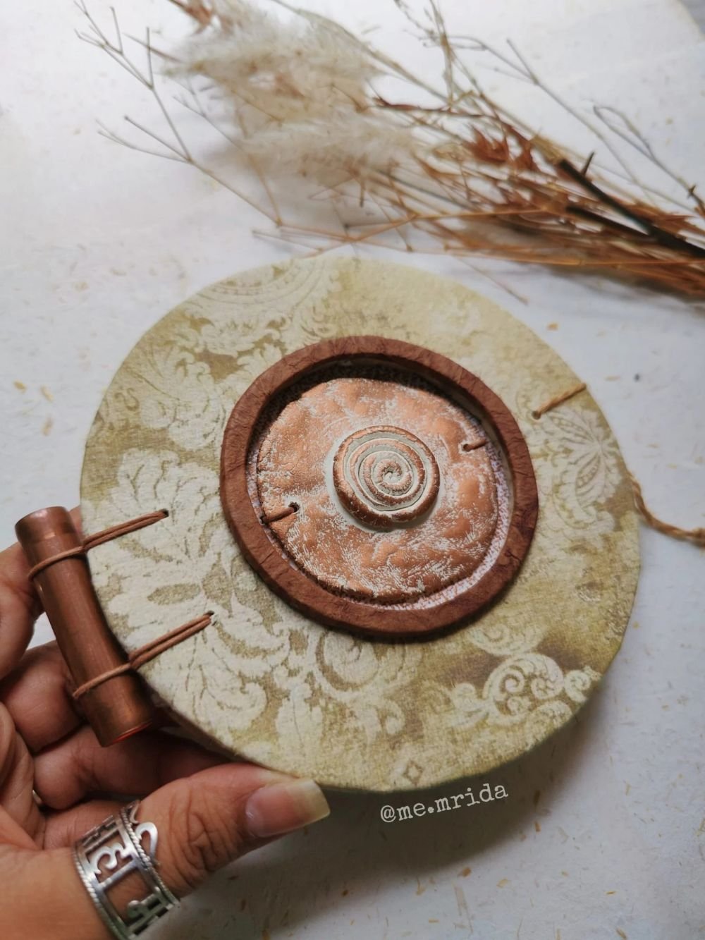 Cover – Printed handmade paper (300 gsm), handmade clay embellishments and frame.